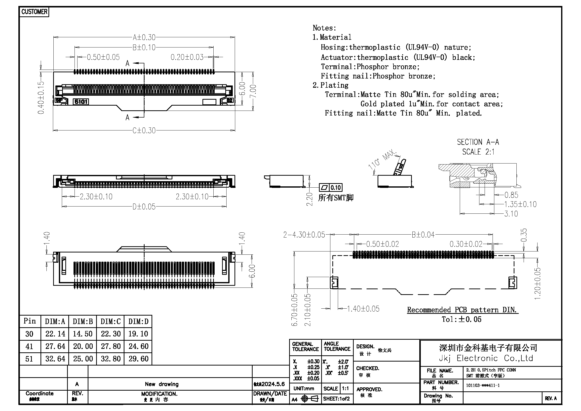 FPC0.5mm窄板 H2.2 翻盖 51P 镀金连接器